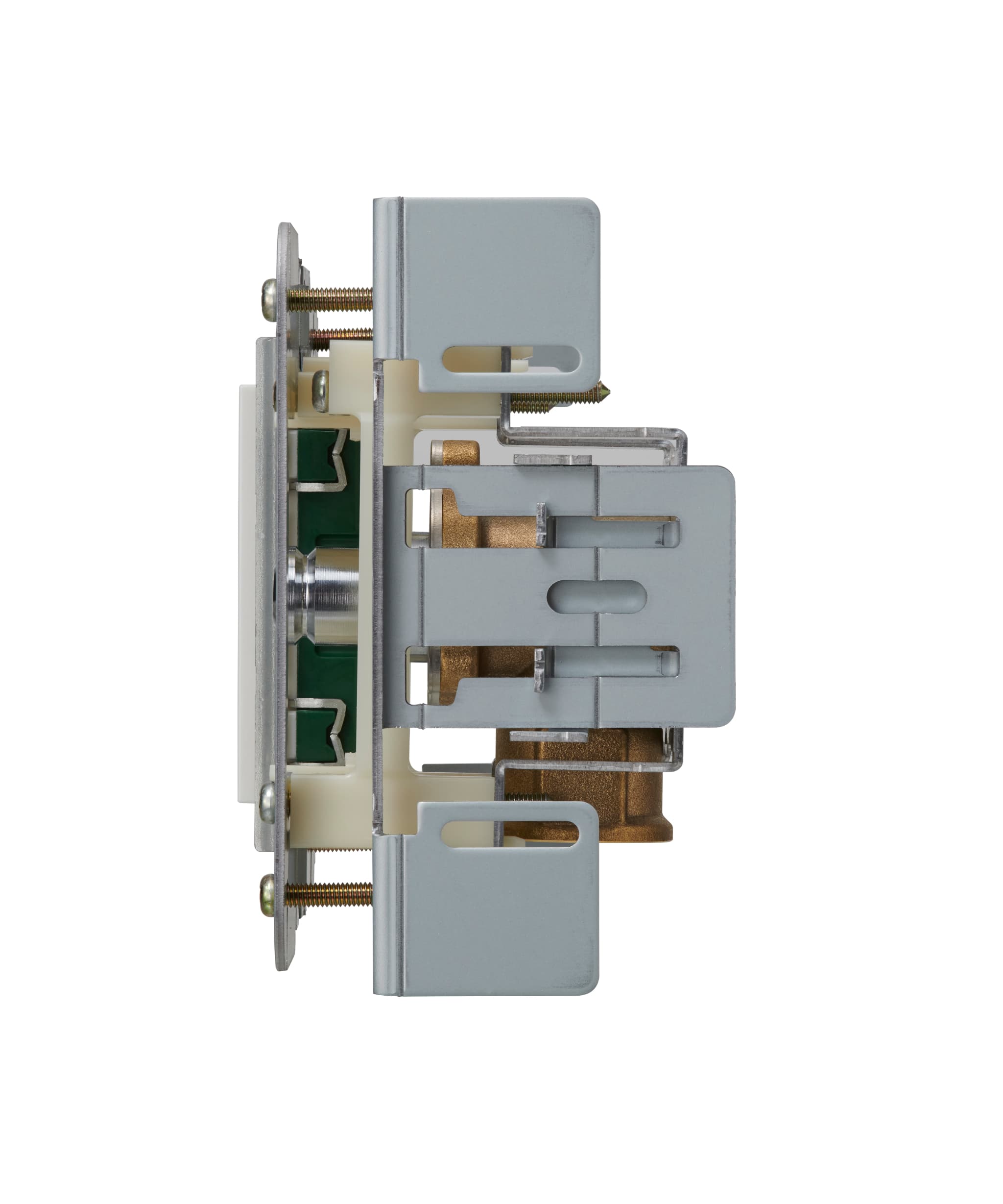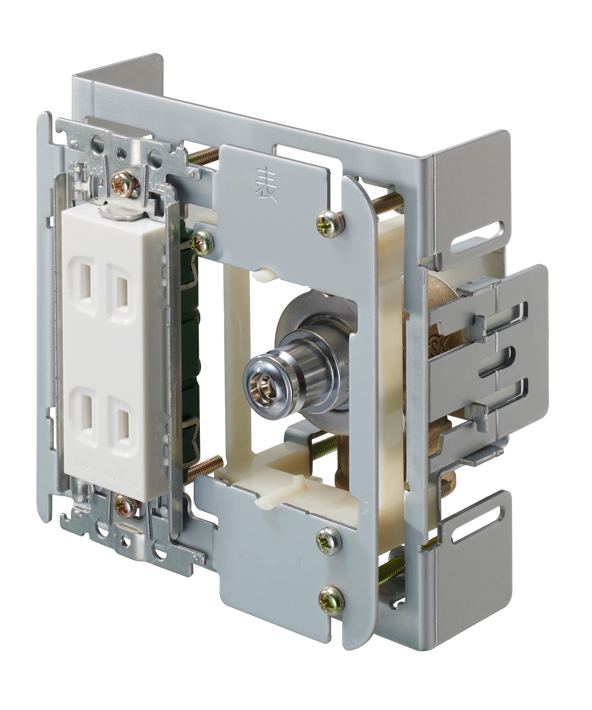 固定部材、電気二口コンセント部材、化粧プレート(ホワイト)が同梱されています。