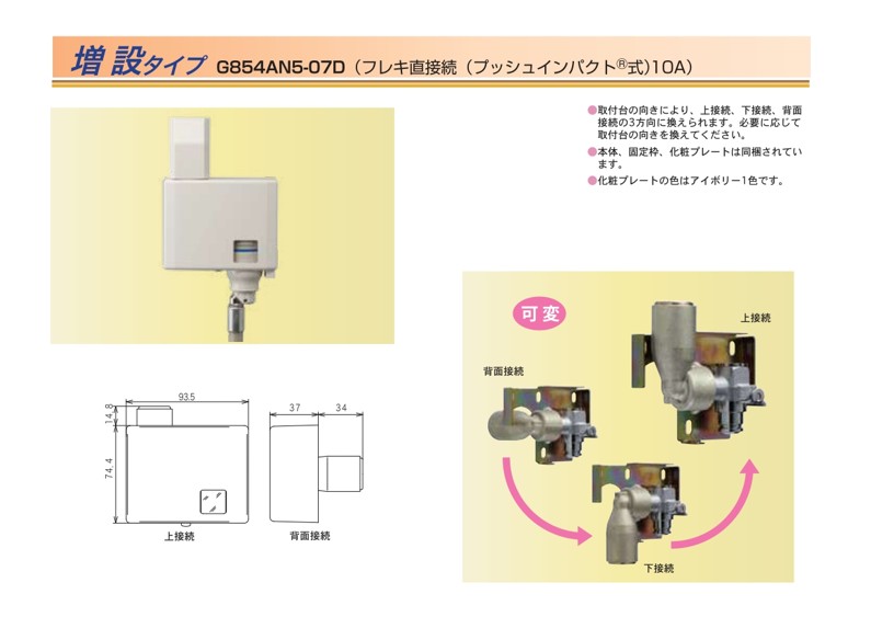 本体、固定枠、化粧プレートは同梱されています。取付台の向きにより、上接続、下接続、背面接続の3方向に換えられます。必要に応じて取付台の向きを換えてください。化粧プレートの色はアイボリーの1色です。