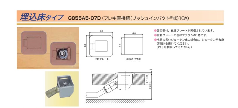 固定部材、化粧プレートが同梱されています。化粧プレートの色はブラウンの1色です。毛足の長いジュータン床の場合は、ジュータン用台座(別売)を用いてください。