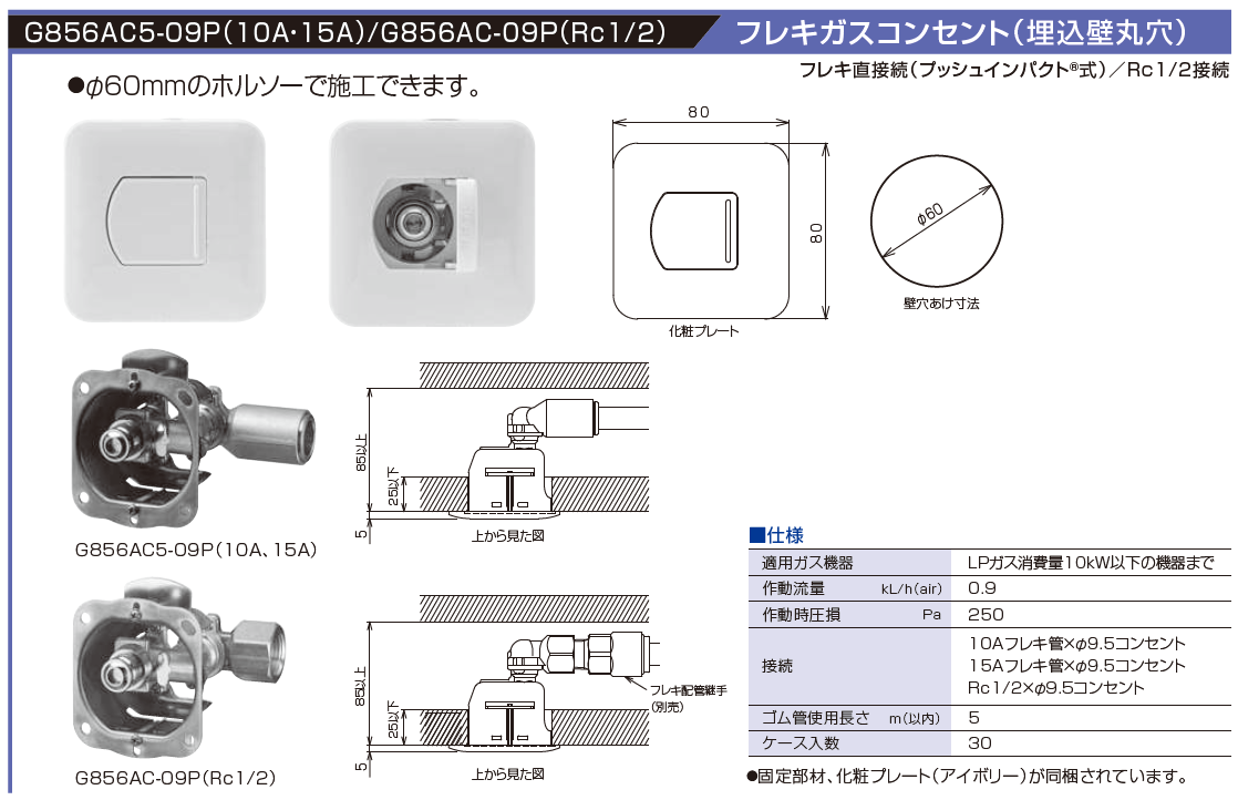 φ60mmホルソーで施工できます。固定部材、化粧プレート(アイボリー)が同梱されています。